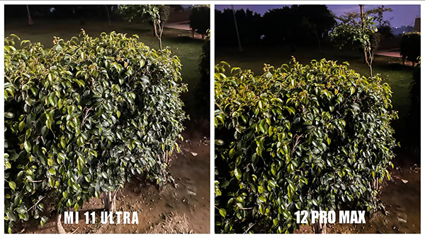 第二組照片的拍攝環(huán)境依然還是在夜間,在效果方面小米11 Ultra和iPhone 12 Pro Max在明暗程度上也有著非常明顯的區(qū)別。小米11 Ultra拍攝照片依然亮度較高,不過曝光度雖然高但并沒有出現(xiàn)局部曝光過度的現(xiàn)象,整體的曝光比較均勻。不光是照片中間區(qū)域的樹葉曝光度較好,周邊的曝光度細(xì)節(jié)部分表現(xiàn)也都非常不錯(cuò)。反觀iPhone 12 Pro Max拍攝照片對(duì)比,整體的曝光度要明顯低一個(gè)層次,同時(shí)樹木周圍的亮度低,并且細(xì)節(jié)部分表現(xiàn)也一般。