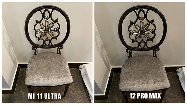 iPhone 12 Pro Max拍攝的照片中,整體的光線較暗,所以凳子表面的絨布細(xì)節(jié)表現(xiàn)一般,另外凳子的靠背部分和墻壁的顏色都偏暗,整體的效果和小米11 Ultra相比要差不少。