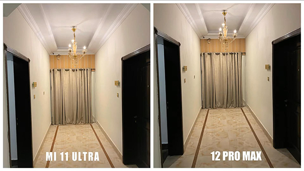 第四組照片的拍攝對(duì)比,iPhone 12 Pro Max拍攝的照片終于不再那么昏暗,而且亮度方面也略微有些起色。但是拍攝的效果和小米11 Ultra之間相比,依然還是存在差距。小米11 Ultra拍攝的照片中的亮度更高,地面地磚的紋路表現(xiàn)也更加豐富。iPhone 12 Pro Max雖然拍攝的照片亮度也不錯(cuò),但是細(xì)節(jié)方面和小米11 Ultra相比,還是有不少欠缺的地方。比如窗簾和地磚的顏色比較深,而且不如小米11 Ultra那么鮮艷。