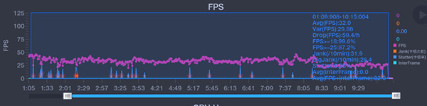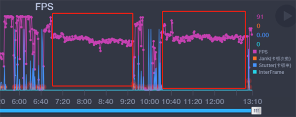 《QQ飛車(chē)》游戲幀率曲線(紅框內(nèi)為游戲中)