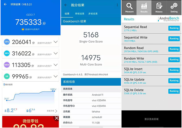 iQOO 7的安兔兔綜合得分為73萬分,我們測試過的驍龍865機型要高上10萬分左右;在GeekBench 4的跑分當中,iQOO 7單核得分為5168,多核得分為14975的成績,也都要比驍龍865高上不少;使用AndroBench測試其連續(xù)讀取的速度為1779.7MB/s, 連續(xù)寫入的速度為783.9MB/s, 隨機讀取的速度為297.04MB/s, 隨機寫入的速度為274.44MB/s,每一項都是采用USF2.1的中端機型的兩倍以上。