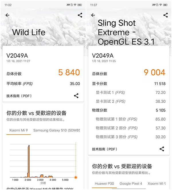 3DMark的測試中,渲染分辨率為2K的Wild Life測試iQOO 7得分5840分,大家比較熟悉的Sling Shot測試得分為9004,也都是超級強悍的成績。