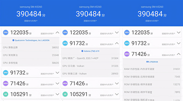 驍龍750G集成最新第五代Qualcomm人工智能引擎AIEngine,能夠通過(guò)直觀交互賦能智能照片和視頻的拍攝、語(yǔ)音翻譯、先進(jìn)的AI成像以及通過(guò)AI增強(qiáng)的游戲體驗(yàn)。該引擎可實(shí)現(xiàn)高達(dá)每秒4萬(wàn)億次運(yùn)算(4TOPS),與驍龍730G相比,AI性能提升了20%。實(shí)際通過(guò)安兔兔跑分成績(jī)也將近40萬(wàn)。