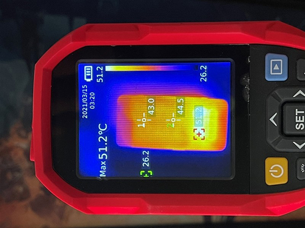 在裸機(jī)情況下運(yùn)行GFXBench,機(jī)身背面最高溫度為51℃,其位置恰好在后攝下方。整體背部溫度在44℃左右,此外邊框也承擔(dān)了一部分散熱的任務(wù),平均溫度從上到下45.9℃到41.7℃不等。