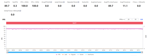 最高畫質開啟抗鋸齒游玩《王者榮耀》,平均幀率為89.7FPS,基本全程都能保持滿幀運行。