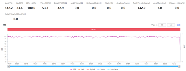 《王牌戰(zhàn)士》對于高刷屏擁有極佳的兼容性,無論是多少刷新率都能實現(xiàn)自動適配。在最高畫質下,開啟144Hz模式游玩,刪去統(tǒng)計結果中系統(tǒng)自動鎖60幀部分的干擾數(shù)據(jù),能看到游玩過程中平均幀率為142.2FPS,堪稱絲滑流暢。