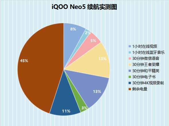 實踐出真知,為了看看iQOO Neo5的續(xù)航究竟有多好,我進(jìn)行了一次重度使用體驗。測試包括了1小時在線視頻、1小時在線藍(lán)牙音樂、30分鐘微信語音、30分鐘《王者榮耀》、30分鐘《和平精英》、30分鐘電子書以及30分鐘4K視頻錄制。iQOO Neo5不僅順利完成了這些測試,測試結(jié)束后竟然還剩余45%的電量。單看具體數(shù)據(jù)則更令人震驚,1小時在線藍(lán)牙音樂竟然只耗電2%,真配得上那句廣告詞——“久到離譜”。