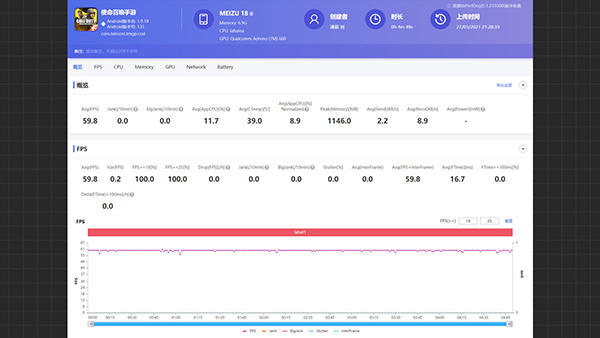 附上使命召喚的幀率表現(xiàn)測(cè)試數(shù)據(jù),在高幀率模式下整場(chǎng)游戲下來(lái)保持在59.8Fps左右(目前開(kāi)啟高幀率后還無(wú)法適配120Hz),且通過(guò)折線(xiàn)圖不難看出幀率上下浮動(dòng)不大,整體發(fā)揮還是非常穩(wěn)定的。