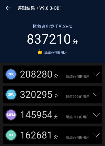 室溫約25℃下,安兔兔 V9.0.3版本中跑分為837210分。