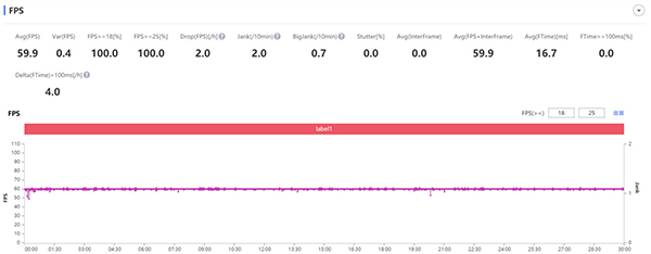 然后是曾經(jīng)的旗艦機(jī)考卷——《和平精英》,《和平精英》尚未適配90幀模式,因此在HDR高清加60幀模式下進(jìn)行測(cè)試。在幀數(shù)圖中可以看出,幀率曲線都非常平滑,基本沒有發(fā)生過卡頓,30分鐘游戲后平均幀率為59.9幀,背部最熱處約38.4℃。