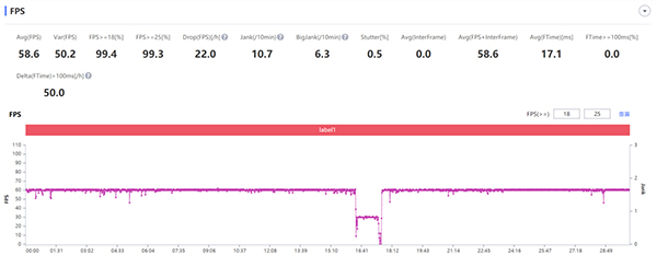 接下來(lái)是優(yōu)化出色的射擊游戲《使命召喚手游》,與《和平精英》一樣,它也尚未適配90幀模式,只能在較高畫質(zhì)下開啟60幀模式。不過它的幀數(shù)依舊非常穩(wěn)定,30分鐘游戲后平均幀率為58.6幀,背部最熱處僅37.3℃,整體的游戲體驗(yàn)非常不錯(cuò)。