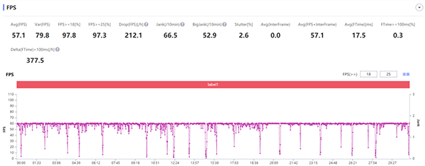 在最高特效中,拯救者電競(jìng)手機(jī)2 Pro的表現(xiàn)令人驚喜。除了場(chǎng)景切換時(shí)會(huì)發(fā)生不可避免的掉幀以外,其它時(shí)候都穩(wěn)定在60幀上下。最終30分鐘平均幀率為57.1幀,游戲體驗(yàn)相當(dāng)出色。