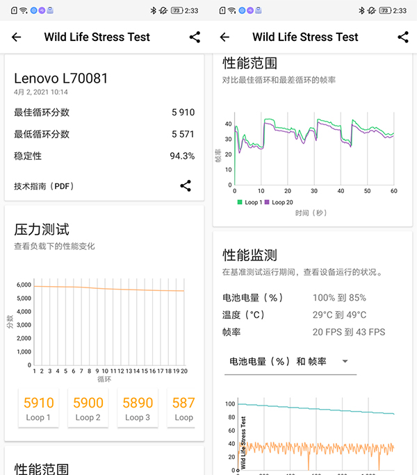 接下來(lái)就是喜聞樂(lè)見(jiàn)的3D Mark Wild Life 20輪測(cè)試,相比上面單輪跑分測(cè)試, 20輪的高壓力跑分測(cè)試更加考驗(yàn)手機(jī)的散熱能力,如果手機(jī)散熱不行,過(guò)熱降頻導(dǎo)致分?jǐn)?shù)下降基本是固定結(jié)局,分?jǐn)?shù)也會(huì)發(fā)生波動(dòng),之前我們測(cè)試過(guò)部分888機(jī)型在這一項(xiàng)中,跑分甚至?xí)o(wú)法完成。