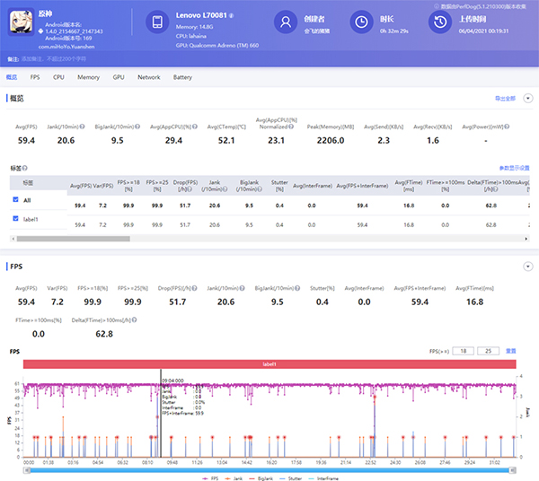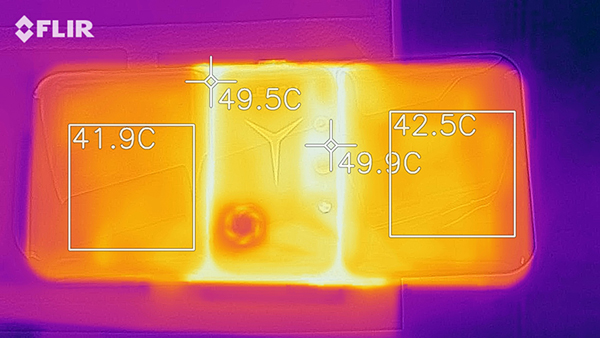 在這30分鐘的游戲過(guò)程中,除了地圖傳送時(shí)的幀數(shù)下降,游戲時(shí)的幀數(shù)都基本穩(wěn)定在60幀,軟件監(jiān)測(cè)到的幀數(shù)也是59.4幀,而且整個(gè)游戲中也沒(méi)有呈現(xiàn)出過(guò)熱降幀的趨勢(shì),成績(jī)相當(dāng)不錯(cuò),而此時(shí)手機(jī)外殼的溫度,達(dá)到49度,比3D Mark壓力測(cè)試要稍微低一些,但雙手握持區(qū)域卻保持相當(dāng)舒適的溫度,完全避開(kāi)高溫區(qū)域,不會(huì)像其他手機(jī)一樣,長(zhǎng)時(shí)間使用會(huì)有低溫燙手的問(wèn)題。