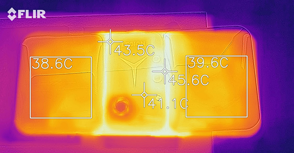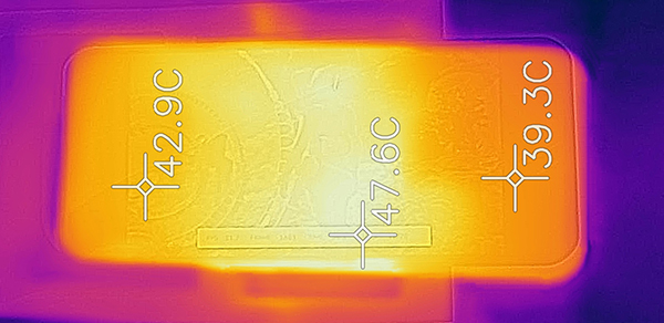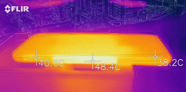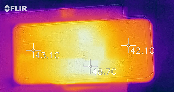 而此時(shí)手機(jī)外殼的溫度達(dá)到50度,在后蓋中部的金屬區(qū)域,但兩側(cè)握持區(qū)域只有42度,相對(duì)而言涼爽了許多,而且邊框溫度的分布也和后蓋一樣,集中在手機(jī)中部,手掌完全不會(huì)觸摸到中間的高溫區(qū)域。