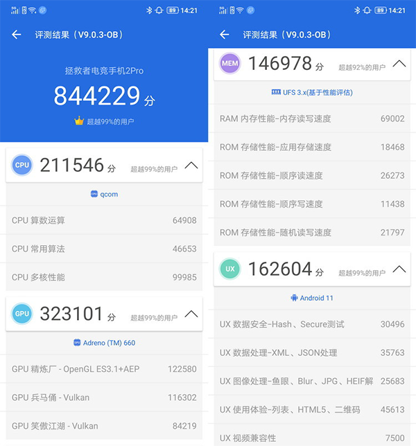 從安兔兔V9.0.3-OB的測(cè)試結(jié)果來(lái)看,我們手頭這臺(tái)16+512GB版的拯救者2 Pro在CPU、GPU,以及日常用戶體驗(yàn)三個(gè)大項(xiàng)上都取得了不錯(cuò)的成績(jī),而超過(guò)84萬(wàn)分的總分也毫無(wú)疑問(wèn)地成為了當(dāng)前最高的性能水準(zhǔn)。