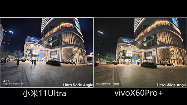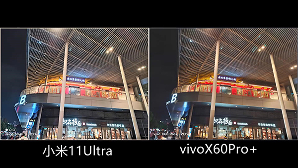 第三組照片的拍攝效果,是在夜間的環(huán)境中,同時也是在商場的門口。區(qū)別上主要有兩點,第一個區(qū)別,就是小米11 Ultra拍攝的照片中,建筑物的外表面是偏藍色的,vivo X60 Pro+拍攝的建筑物外表面則是偏灰色的。第二個區(qū)別的地方,在商場門口的地磚色彩方面,小米11 Ultra拍攝的地磚顏色偏灰色,vivo X60 Pro+拍攝的地磚顏色偏黃色。所以在兩張照片中的區(qū)別,小米11 Ultra和vivo X60 Pro+之間,還是十分明顯的。