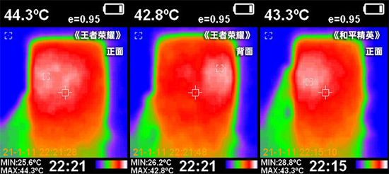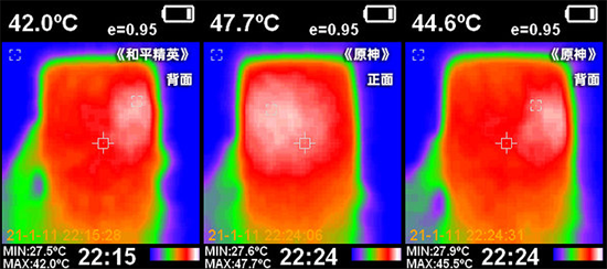 在以上三款游戲當(dāng)中,小米11 Pro的幀率表現(xiàn)還是比較穩(wěn)定的,所以性能釋放基本不用擔(dān)心。不過(guò)這時(shí)大家就要關(guān)心溫度了,所以下面是小米11 Pro在運(yùn)行以上三款游戲各一小時(shí)后的溫度情況。這里的游戲設(shè)置與幀數(shù)測(cè)試相同,環(huán)境為26℃空調(diào)房。
