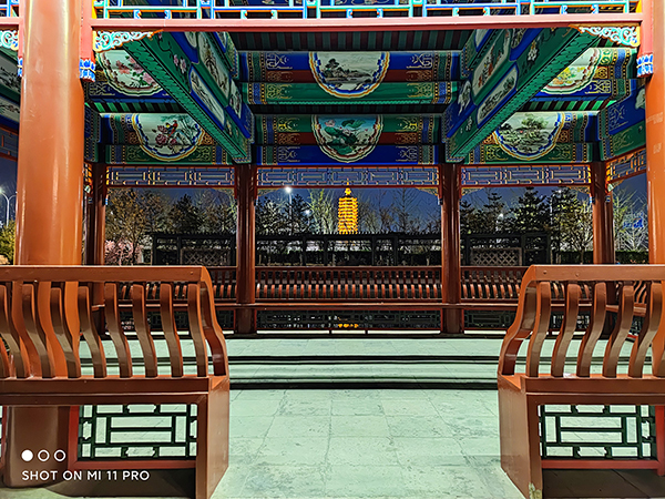 而在西海子公園,可以看到遠處的燃燈塔,涼亭和燈塔相映成趣。