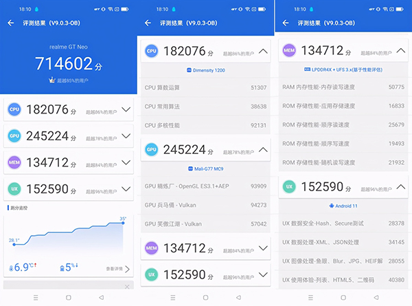 而在實(shí)際的安兔兔跑分測(cè)試中,真我GT Neo也是跑出了714602分的成績(jī),與官方此前公布的跑分?jǐn)?shù)據(jù)也是并無出入。