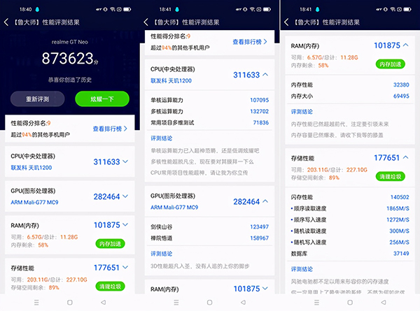 在魯大師跑分測(cè)試中,真我GT Neo同樣也是跑出了873623的成績(jī),綜合跑分測(cè)試方面來說,搭載了天璣1200芯片的真我GT Neo在核心性能實(shí)力方面,確確實(shí)實(shí)是達(dá)到了旗艦水準(zhǔn),與目前一眾驍龍870機(jī)型旗鼓相當(dāng)。