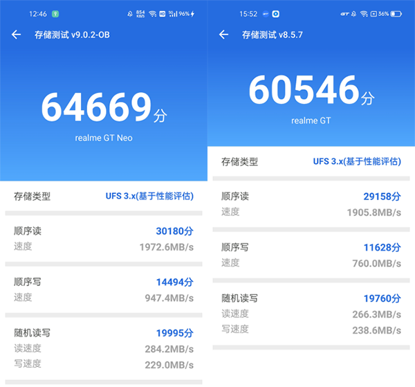 讀寫(xiě)性能上realme 真我GT Neo搭配雙通道UFS 3.1,相比于realme 真我GT的滿血版LPDDR5+UFS 3.1在跑分上竟然還超過(guò)了realme真我GT,實(shí)際上程序的打開(kāi)以及切換都很快,實(shí)際區(qū)別并不大。