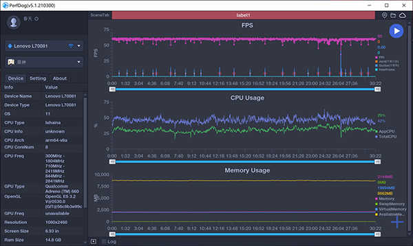 通過PerfDog監(jiān)測軟件可以看到,連續(xù)30分鐘最高畫質(zhì)下玩《原神》,幀率波動極小,平均幀高達58.5幀,而且后面繼續(xù)玩下去依然是這般穩(wěn)定的表現(xiàn),直到電量接近用完也不降屏幕亮度和性能釋放。我覺得這應(yīng)該就是目前最強的電競手機了,而且沒有之一。