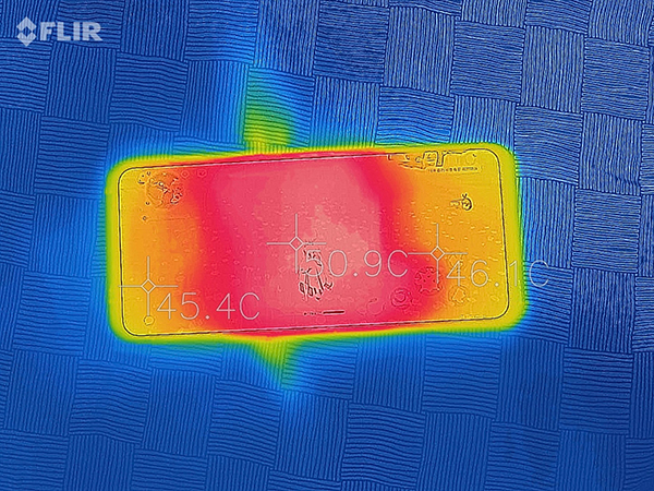 室溫約22度環(huán)境,用30分鐘最高畫質(zhì)《原神》拷機,通過熱成像儀可以看到,機身無論正反面,兩側(cè)的溫度都要明顯低于中間區(qū)域,背面兩側(cè)只有43度左右,雙手并不會覺得燙手。中間主要硬件區(qū)域表面溫度突破了50度。此時機身正上方中間區(qū)域包含進風(fēng)口的溫度也接近50度,但肩鍵區(qū)域的溫度只有40度左右。