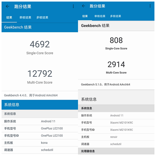我們先來(lái)跑個(gè)分,首先是體現(xiàn)CPU理論性能的GeekBench4,一加9R獲得了單核4692,多核12792的分?jǐn)?shù),GeekBench5中,一加9R獲得了單核808,多核2914的分?jǐn)?shù),屬于驍龍870機(jī)型的正常水平。