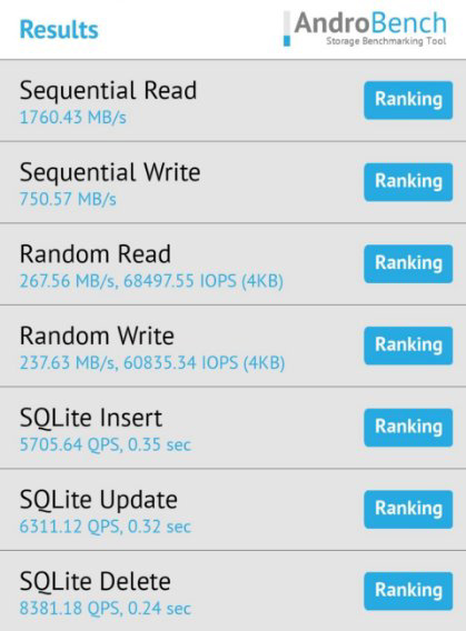 然后是代表存儲(chǔ)性能的AndroBench5,實(shí)測(cè)跑分如圖。