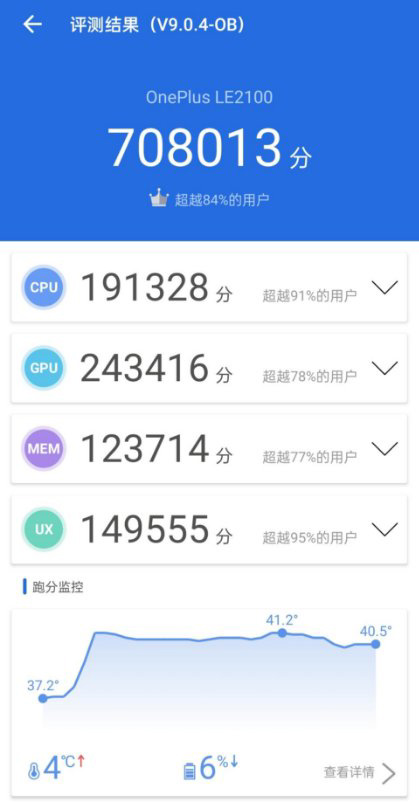 最后是代表綜合性能的安兔兔跑分,一加9R獲得了708013分,符合驍龍870機(jī)型的正常表現(xiàn)。