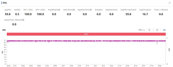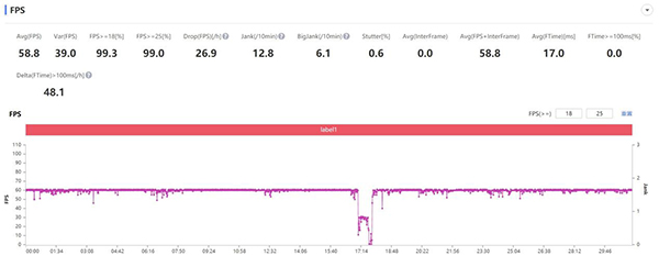 實測也的確如此,在射擊游戲《使命召喚手游》中,可以開到高清極限幀率,全程操作流暢,基本都穩(wěn)定在60幀,最終30分鐘平均幀率達到了58.8幀。并且發(fā)熱也并不嚴重,背部最熱處僅39℃。