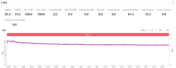 在《王者榮耀》中,已經(jīng)適配了超高畫質(zhì)90幀,但只有在早期對線中可以跑滿90幀,后期大規(guī)模團戰(zhàn)會穩(wěn)定在80幀左右,但幀率比較平滑,沒有卡頓感,最終30分鐘平均幀率81.4幀,背部最熱處38.8℃。