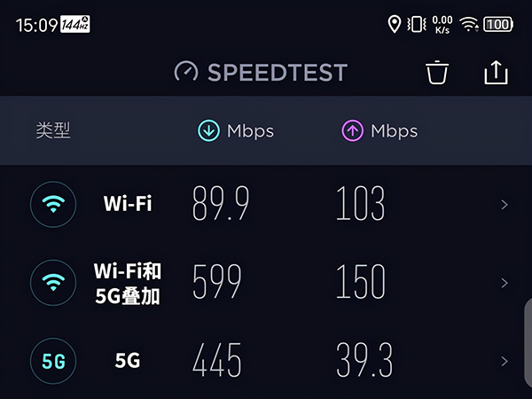 比如在室內(nèi)5G信號并不是很好,下載和上傳分別只有445Mbps和39.3Mbps。這時我們只要開啟網(wǎng)速疊加,并確保勾上測試網(wǎng)速的APP,就能把室內(nèi)的Wi-Fi和5G網(wǎng)速疊加,達到任意單獨網(wǎng)絡(luò)都不能達到的更高網(wǎng)速:599Mbps下載和150Mbps上傳。