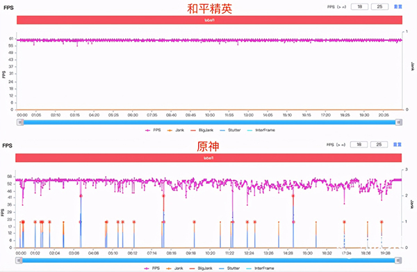 主觀感受來看,即便開到高幀率,兩款游戲都基本沒出現(xiàn)過卡頓的情況。不過,測試軟件的記錄卻有明顯不同?!负推骄ⅰ沟谋憩F(xiàn)很穩(wěn)定,能一直跑在60幀(不支持90幀);但「原神」就有點(diǎn)“尷尬”了,不說了…直接看圖吧。
