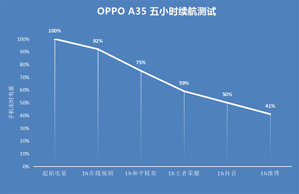 下面就是經(jīng)過5小時(shí)的測(cè)試成績(jī),OPPO A35消耗了59%的電量,剩余了41%的電量,這樣的成績(jī)表現(xiàn),放在手機(jī)市場(chǎng)中,其競(jìng)爭(zhēng)力還是十分強(qiáng)悍的。而對(duì)于一款擁有輕薄機(jī)身、大內(nèi)存、大電池的手機(jī)而言,這樣的續(xù)航表現(xiàn)可以說是非常優(yōu)秀。從日常用機(jī)方面考慮,OPPO A35在充滿100%電量的情況下,輕松滿足一天的辦公或娛樂需求是完全沒有問題的。