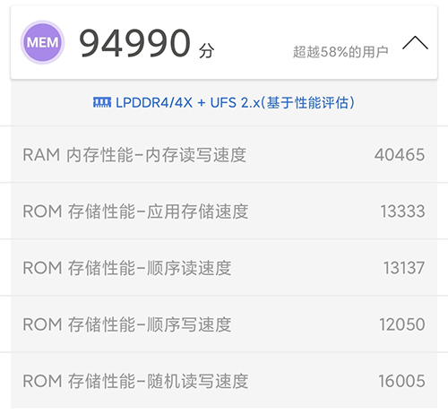 不過,略顯遺憾的是,780G最高仍然只支持LPDDR4X的內(nèi)存規(guī)格,因此小米11青春版的存儲方案為LPDDR4X的內(nèi)存+UFS2.2的閃存,跑分如圖,和UFS3.0相比連續(xù)讀取有一定差距,其他項目速度差不多,日常流暢使用不成問題。
