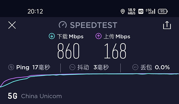 我們選用專業(yè)網(wǎng)速測試軟件,選用默認(rèn)連接節(jié)點(diǎn),測試5G網(wǎng)絡(luò)條件下一加9R的傳輸速度。實測其在5G網(wǎng)絡(luò)(SA+NSA)下可以達(dá)到下行860Mbps,上行168Mbps,抖動3ms的水準(zhǔn)。