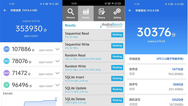 realme真我V13搭載臺積電7nm工藝制程的天璣700處理器,內(nèi)存是LPDDR4X規(guī)格的和閃存則是UFS2.1規(guī)格的,安兔兔跑分達(dá)到35萬分,讀寫速度也是主流水平,能夠應(yīng)付大部分的應(yīng)用場景。為了更進(jìn)一步的保證手機(jī)的多任務(wù)流暢度,realme 真我V13還使用了DRE動態(tài)內(nèi)存擴(kuò)展技術(shù),動態(tài)的實(shí)現(xiàn)內(nèi)存8+3的升級。