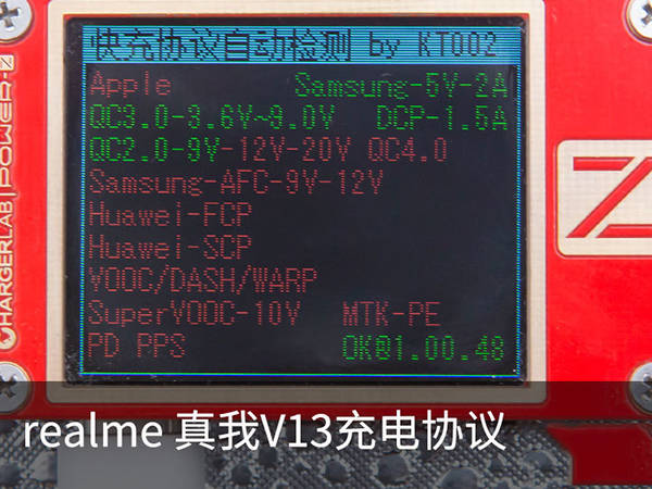 也就是說,realme真我V13配備的是18W疾速快充,兩者配合構(gòu)成了長續(xù)航體驗的完整閉環(huán)。經(jīng)過我們實際測試,18W疾速快充支持Samsung 5V/2A、DCP 1.5A、QC3.0 9V、QC2.0 9V等協(xié)議,充電器線材重量與便攜性尚可。