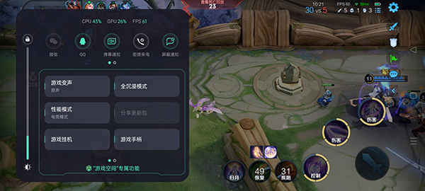 當(dāng)我們?cè)谕嬗螒虻臅r(shí)候,屏幕左上角有一條小光帶,只需輕輕一劃就能呼出游戲助手,里面匯聚了非常多的功能,不僅顯示了CPU、GPU的占用率,還能實(shí)現(xiàn)游戲變聲、拒接來電、開啟游戲手柄等。