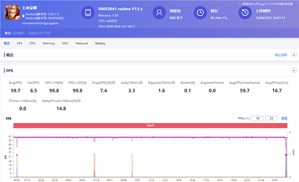 當然了,跑分僅僅只能當做參考,最為主要的還是要看游戲體驗如何。因此,筆者挑選了手游當中最為熱門的手游進行了測試。我們從下圖可以看到,分別是《和平精英》、《王者榮耀》以及《戰(zhàn)雙帕彌什》,realme V13這款新機都能很好的保持穩(wěn)定的幀率,在使用的過程當中,能給用戶帶來極為穩(wěn)定的體驗。即使是極為吃“配置”的《戰(zhàn)雙帕彌什》也能輕松應對。