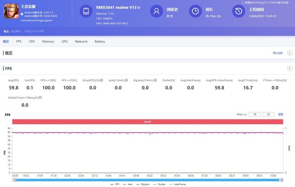 對(duì)于《王者榮耀》來(lái)說(shuō),如果手機(jī)性能不足的話,游戲過(guò)程中會(huì)出現(xiàn)卡頓、掉幀等問(wèn)題。尤其是在5V5團(tuán)戰(zhàn)時(shí)刻,各種技能特效的疊加對(duì)手機(jī)性能提出了更高的要求。通過(guò)實(shí)測(cè)發(fā)現(xiàn),真我V13的平均幀率可以保持在59.8fps,幀率表現(xiàn)基本穩(wěn)定,在10分鐘的全局游戲中,整體游戲體驗(yàn)較為出色。