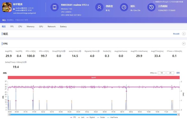 從測(cè)試歷史來(lái)看,《和平精英》比《王者榮耀》更吃性能。對(duì)于真我V13來(lái)說(shuō),可以開(kāi)啟“高清”和“高”幀數(shù)的設(shè)置。從12分鐘的測(cè)試結(jié)果來(lái)看,真我V13的平均幀率可以達(dá)到29.9fps,游戲過(guò)程中不論是激烈的射擊場(chǎng)景還是駕車快速行駛場(chǎng)景,并沒(méi)有出現(xiàn)卡頓情況,大家可以放心玩耍。