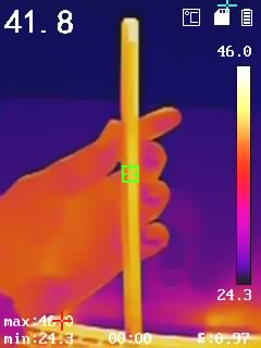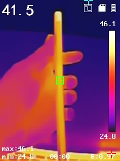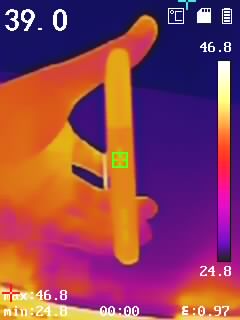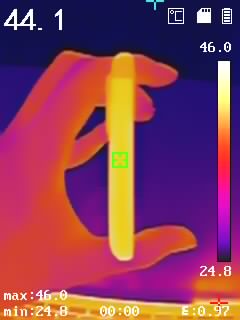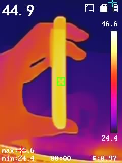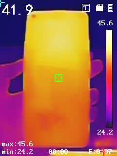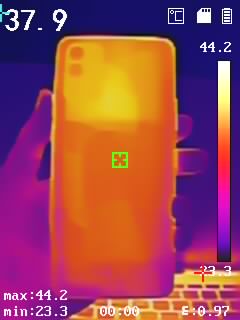 通過(guò)熱成像儀來(lái)了解驍龍870版一加9R的溫度表現(xiàn),分別背面、側(cè)面中框、頂部邊框、底部邊框溫度,具體如下圖(圖3456),機(jī)身背部最高溫度達(dá)到了44.2℃,手感整體溫度相對(duì)適宜。