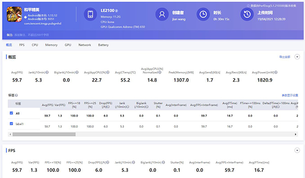 如圖1所示在該模式下,驍龍870版一加9R平均幀率為59.7fps,平均每十分鐘略有小卡頓,平均每十分鐘嚴(yán)重卡頓次數(shù)為0.0,能耗值為1820.9。