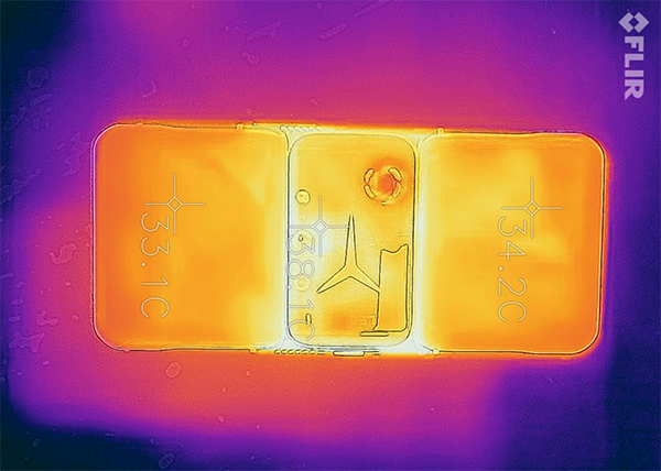 關(guān)于大家關(guān)心的游戲發(fā)熱情況,我也在游戲結(jié)束后第一時(shí)間進(jìn)行了測(cè)量,通過(guò)熱成像圖可以看出拯救者2 Pro背部最高溫度為38.1°,緊靠著攝像頭區(qū)域,而其余兩手握持部分溫度僅34度左右。即使隨著游戲時(shí)間的增加,拯救者2 Pro也不會(huì)出現(xiàn)燙手情況,怎么玩都不怕。