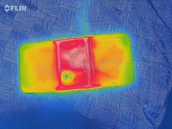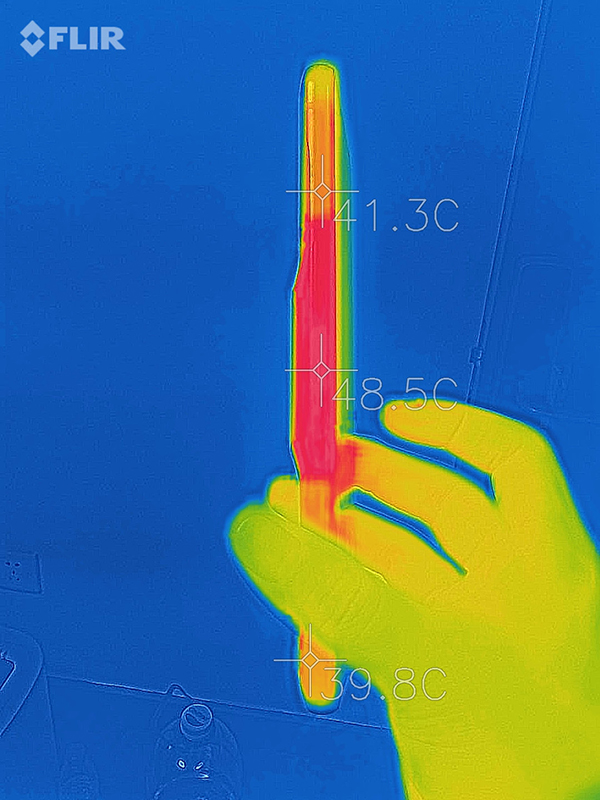 接下來就是實(shí)際的散熱效果測(cè)試了,在室溫約22度環(huán)境,用30分鐘最高畫質(zhì)《原神》拷機(jī),通過熱成像儀可以看到,機(jī)身無論正反面,兩側(cè)的溫度都要明顯低于中間區(qū)域,背面兩側(cè)只有43度左右,雙手并不會(huì)覺得燙手。中間主要硬件區(qū)域表面溫度突破了50度。此時(shí)機(jī)身正上方中間區(qū)域包含進(jìn)風(fēng)口的溫度也接近50度,但肩鍵區(qū)域的溫度只有40度左右。