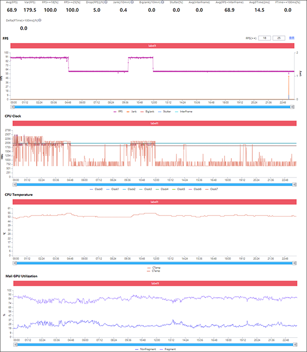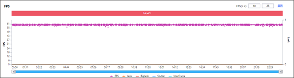 但在常規(guī)不借助工具破解高幀模式的話,60fps的「和平精英」還是非常流暢的,平均幀率59.9fps,從幀率趨勢圖看,全程未有掉幀出現(xiàn)。