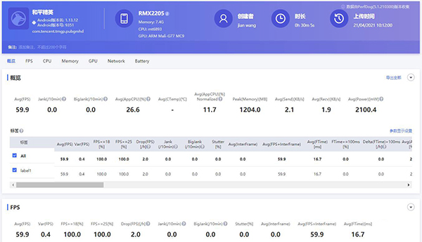 測(cè)試機(jī)型目前還不支持HDR高清的極限模式,只能開(kāi)啟流暢極限模式,在該模式下,聯(lián)發(fā)科天璣1100平均幀率為59.9fps,平均每十分鐘卡頓次數(shù)為0.0,平均每十分鐘卡頓次數(shù)為0.0,能耗值為2100.4。